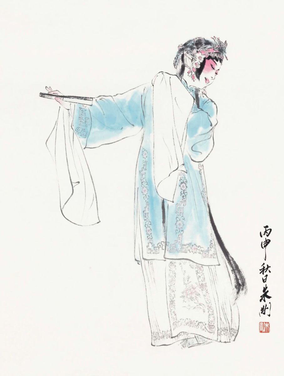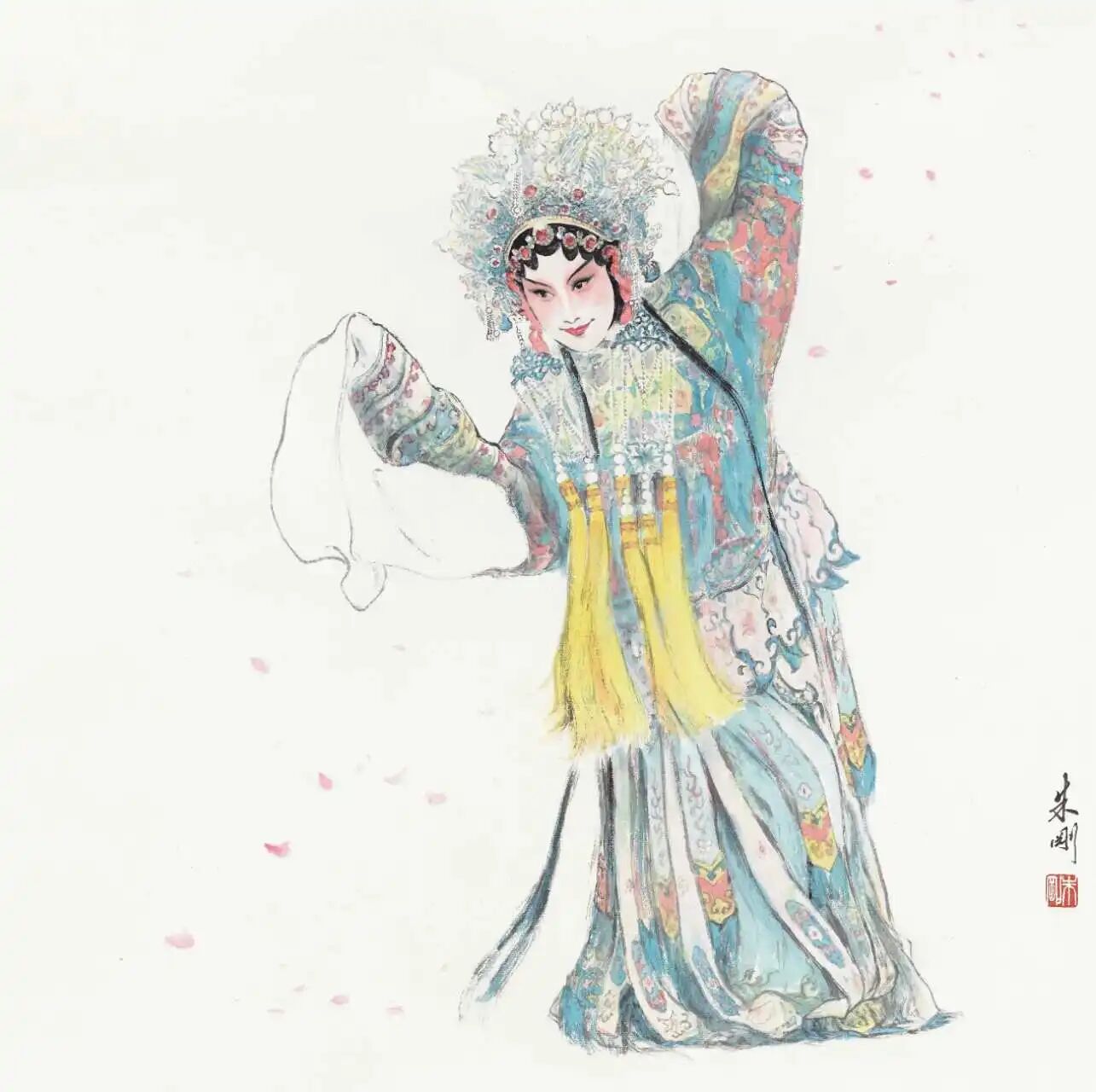 戏曲人物表演中的一招一式,均有出处,程式化很强,画家对此必有深刻研究,方能表现其奥妙。朱刚如此得心应手地描写人物的神情,说明他的戏曲艺术造诣。而在人物形象塑造中,他对各种人物的眼神描写尤为令人赞叹,眼为心声,眼神实为人物形象的中心点,朱刚这方面的作为,说明他对人物造型理解是深刻的,并有与此相应的艺术技巧。至于画面色彩清丽雅致,别有趣味,也是值得我们点赞的。