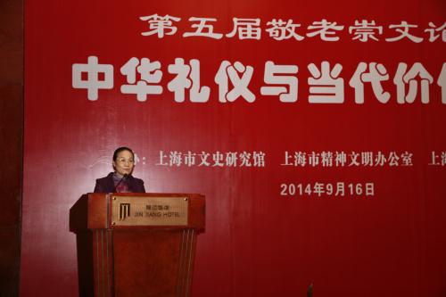 2014年9月16日,由上海市文史研究馆与市精神文明办公室、市老年基金会共同举办的“中华礼仪与当代价值取向——第五届敬老崇文论坛”在上海锦江小礼堂举行,上海市副市长赵雯出席论坛并讲话。本市社科界、高校和有关部门的专家学者,文史馆馆员代表、部分区县文明办和市老年基金会及各区县分会负责人等百余人出席了论坛。上海市文史研究馆馆长郝铁川,市委宣传部副部长、市精神文明办公室主任燕爽和市老年基金会副理事长唐国才分别代表三家主办单位致辞。论坛由上海市文史研究馆副馆长沈飞德主持。